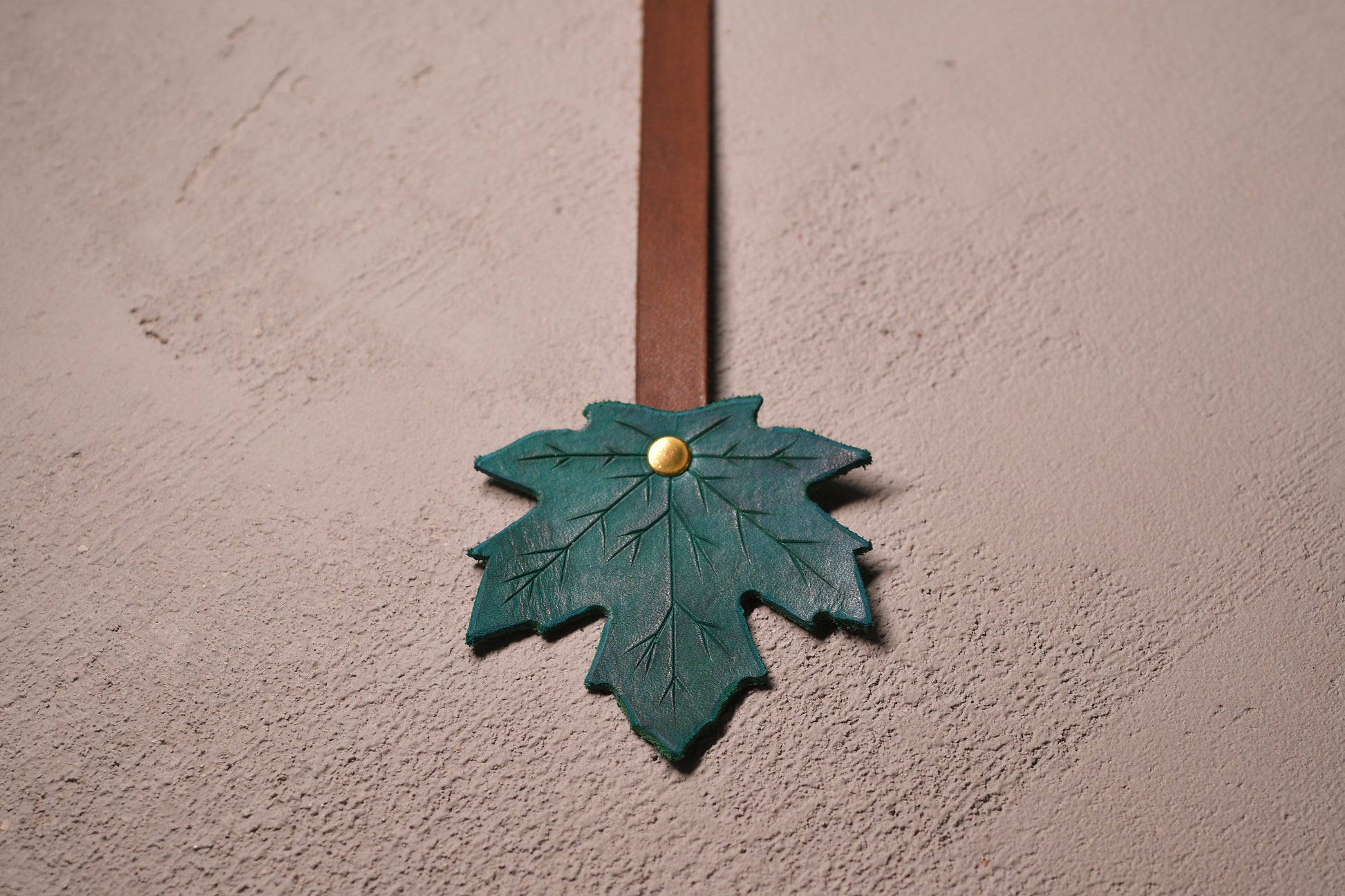 Made of a 12" long full grain veg tanned leather strip with a leather leaf. I hand carve the veins to resemble a Maple leaf and fasten to the strip with a solid brass rivet.